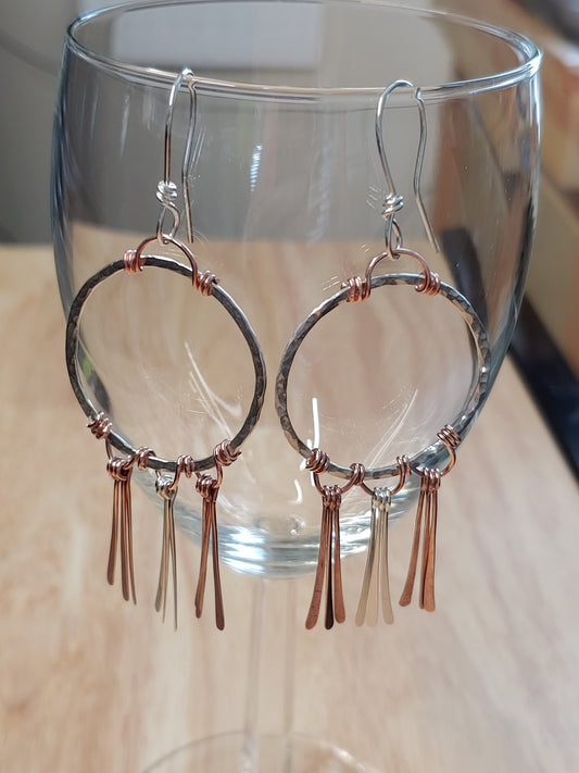 sterling silver hammered hoops with copper & sterling fringe earrings