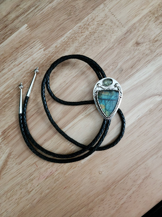sterling silver labradorite & moss aquamarine castellated bezel bolo tie
